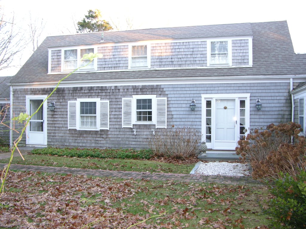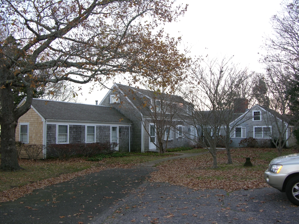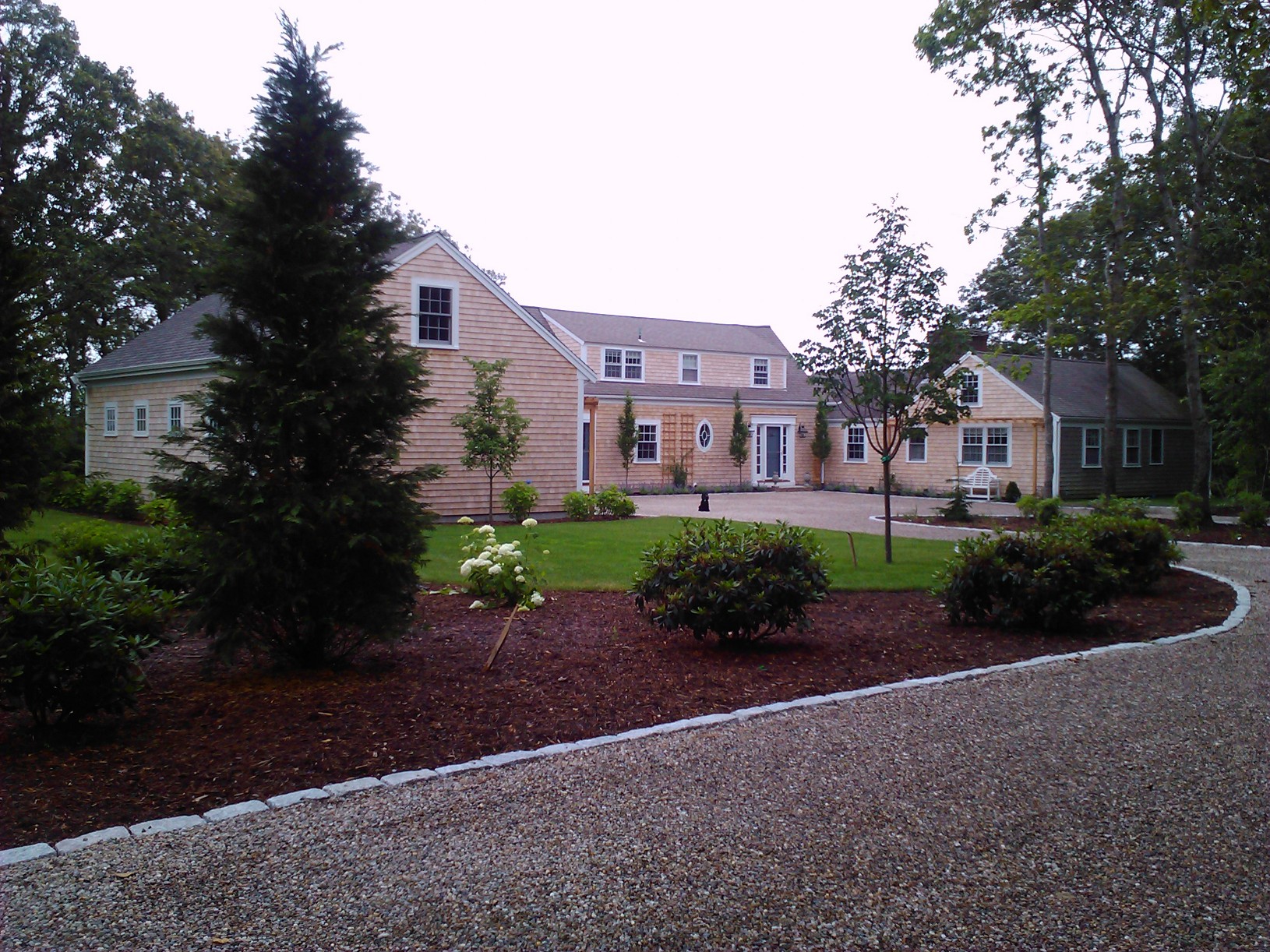 The owner requested a design for a new garage and a renovation to the exterior of her summer home in order to integrate the various existing window, door, and eave details into a single style that coordinated with the new garage. The new garage footprint was rotated 90 degrees to the house to create a partially enclosed, three sided courtyard and circular driveway, creating privacy from the busy street and allowing the relocated driveway to curve around a new required septic system.