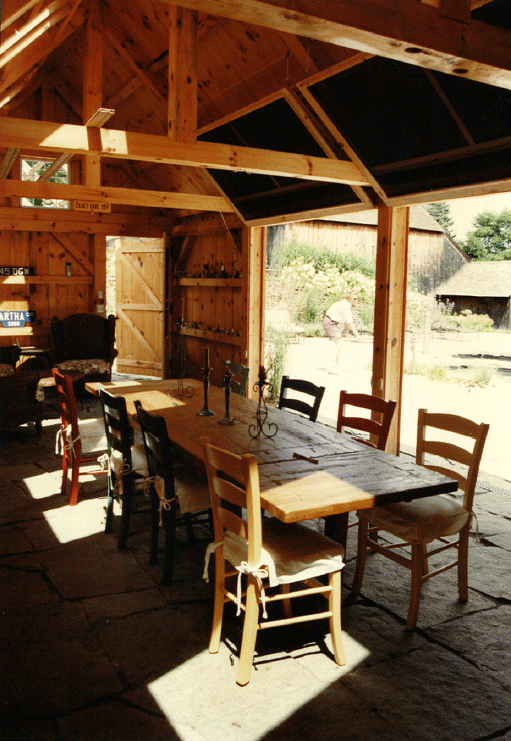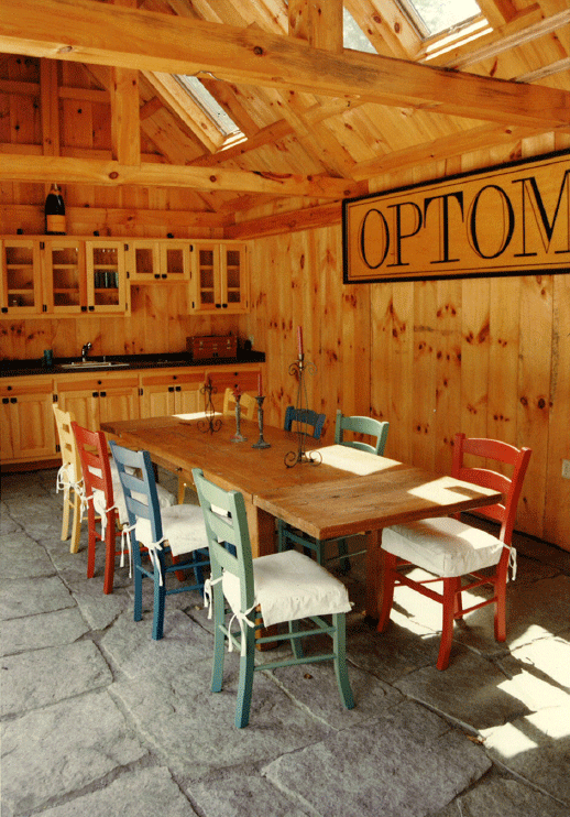 Two professional women wanted to create a new swimming pool and pool house for entertaining family and friends on a hillside above a rural town. Thirty truck loads of soil and rocks were removed to create a large enough flat space to construct the pool and afford some privacy from the town below. The back of the pool house is actually buried into the ground so that the roof appears to rest on the soil. The required program for the pool house was to have a porch covered grilling area, rooms for storage and changing, a bathroom, an outdoor shower and an interior dining room with screened doors to escape the insects in the spring and summer. When the doors are closed, the building looks like an 19th century farm shed.