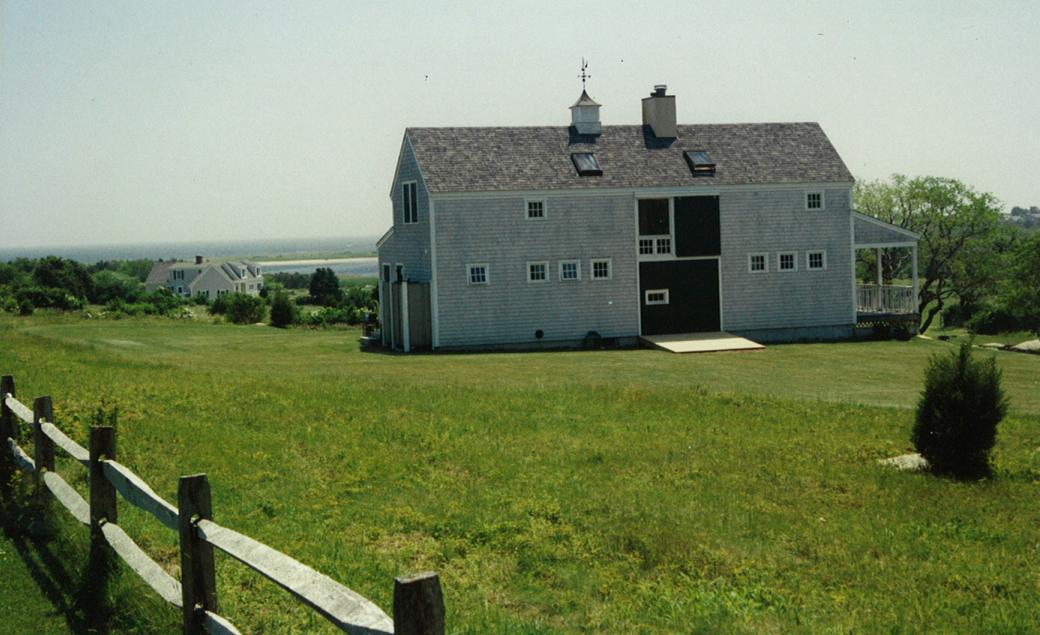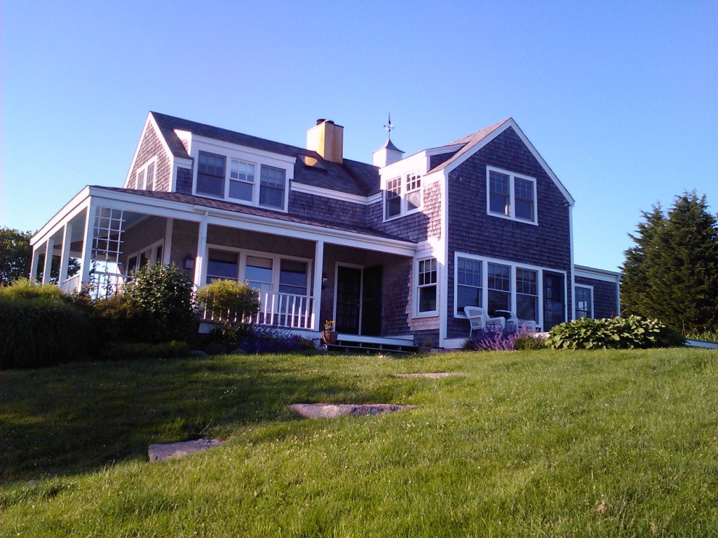 Four middle aged siblings and their families wanted to build a shared summer home on an inherited piece of land with an outstanding view of the Atlantic Ocean near Buzzards Bay. With a limited budget the challenge was to design a home that fulfilled the two requests for a barn-like structure and a 19th century farmhouse. The 2400 sq. ft. house has 4 bedrooms, three full bathrooms, a laundry and one large living/dining and kitchen space. The one car garage in the lower level opens onto the driveway due to the steep slope of the land to the west. The house is heavily insulated with a southern exposure and many energy efficient windows on the south side. The house is passively heated in warmer seasons and in winter uses a forced hot air furnace and fireplace. The open floor plan on the first floor and open stairway in the center of the house create a chimney effect up through the second story skylights which ventilates the house during humid summer days by drawing air in across the lawns and porches.